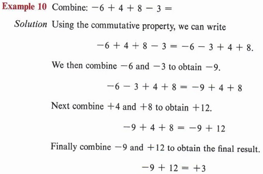 Note in this last example that this order gives easier combinations than combining left to right. The choice of order is left to the student, since the answer will be the same either way.