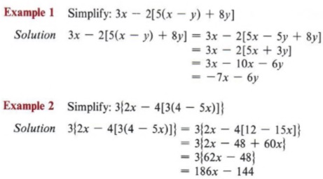 In section 1-2 we learned rules for removing grouping symbols. When combining numbers, we must be sure that each term involved has the proper sign. A term outside a grouping symbol should never be combined with a term inside the symbol, however, like terms within a grouping symbol should be combined before the symbol is removed.