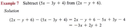 | A very common error in finding the negative of an expression is not changing every sign. Be sure to express the opposite of every term within the grouping symbol if it is preceded by a minus sign. |